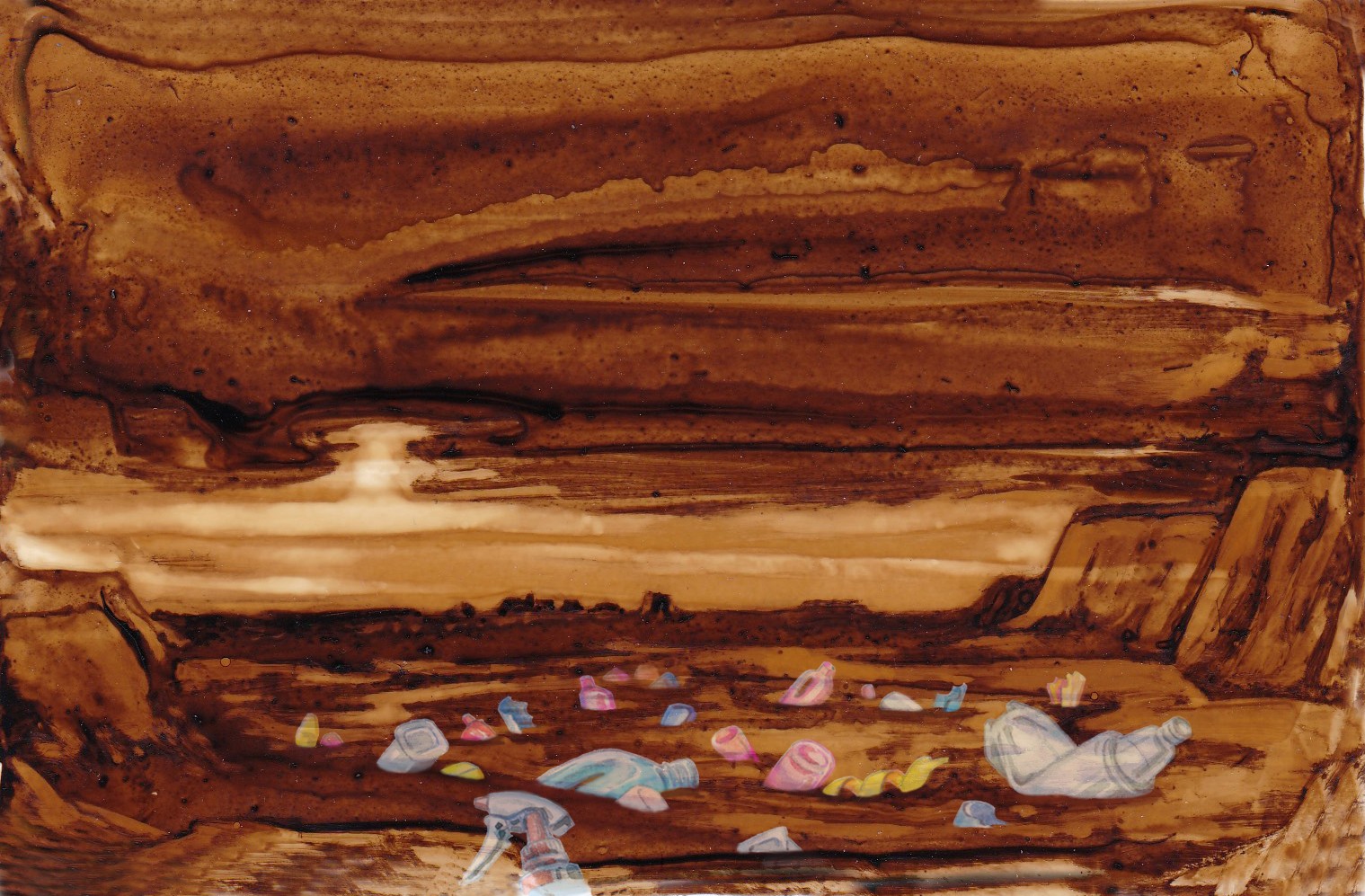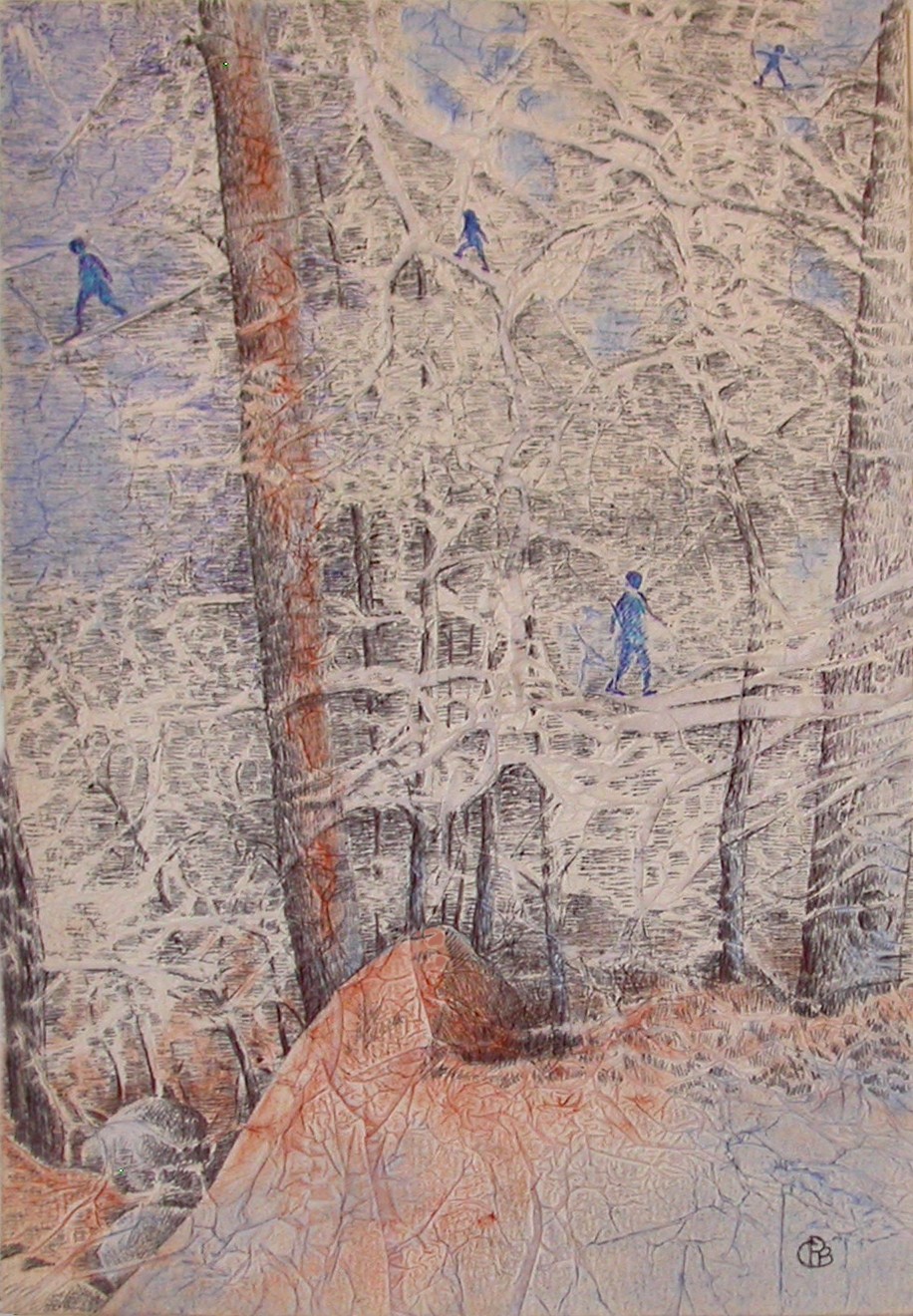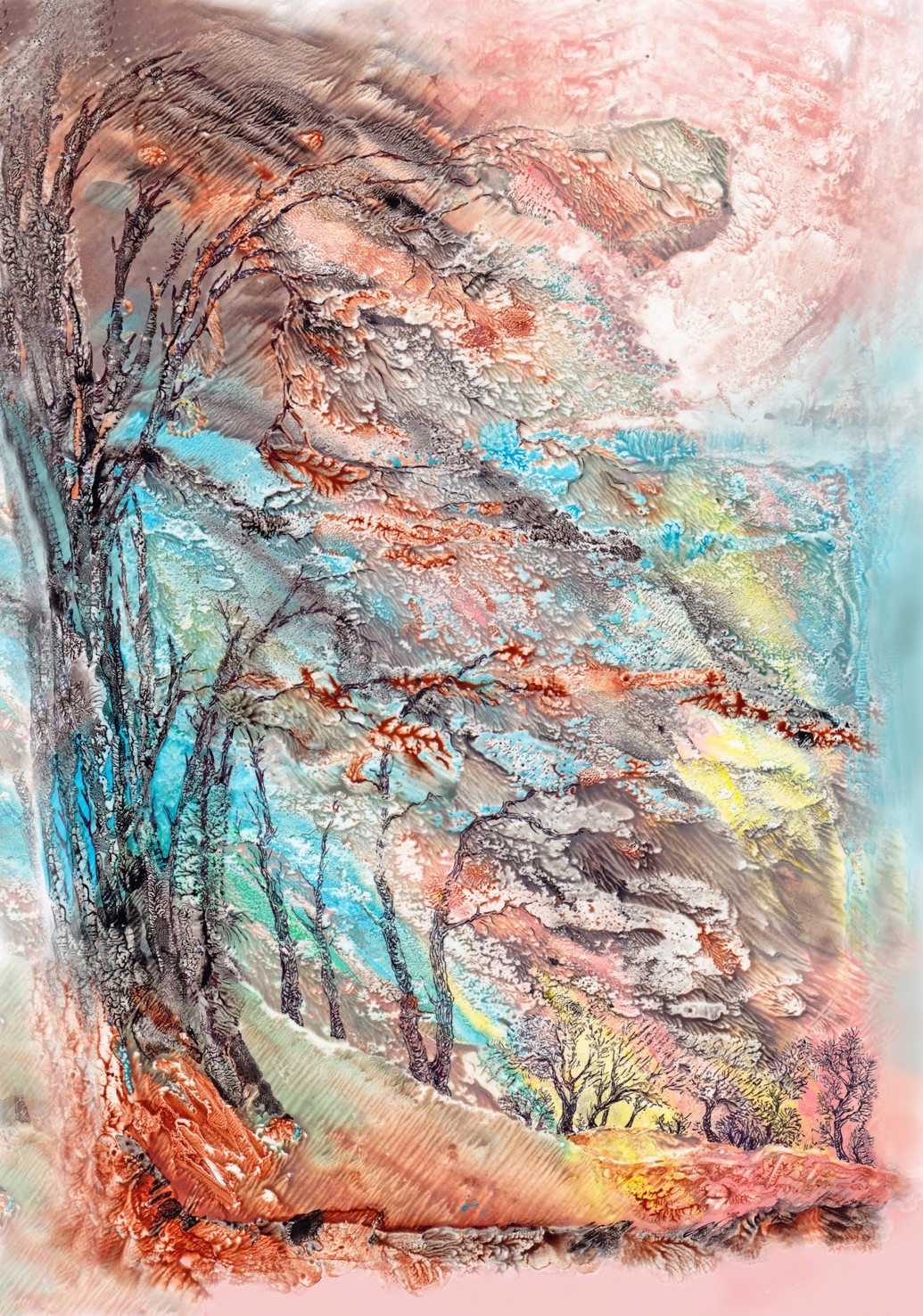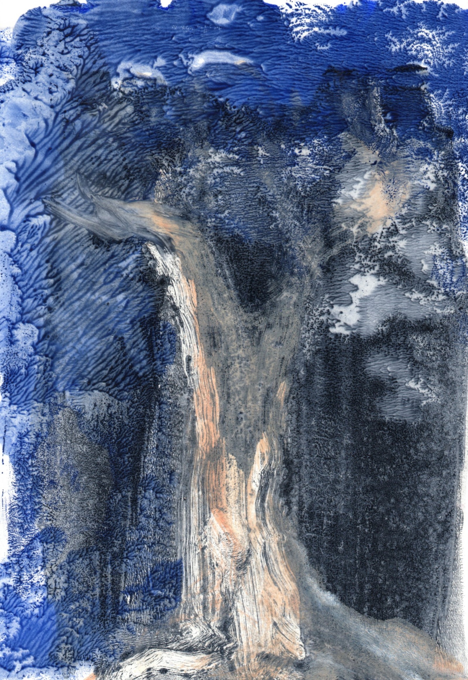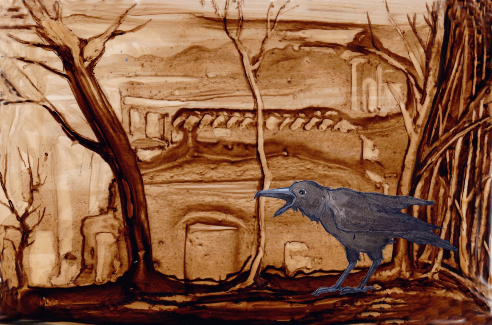 Posé sur le papier, le brou de noix génère matières et formes, propices à l'imaginaire ; Il n'y a plus qu'à poursuivre l'aléatoire ... Et le numérique rajoute ses pixels et continue l'image.