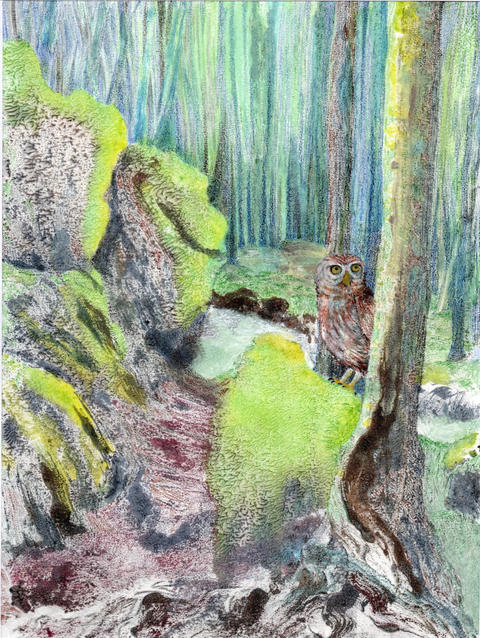 Pages de jeux et de recherches, tous médiums confondus, pastel gras et papier froissé, gouaches pressées ... et aussi pages d'une histoire pour enfants